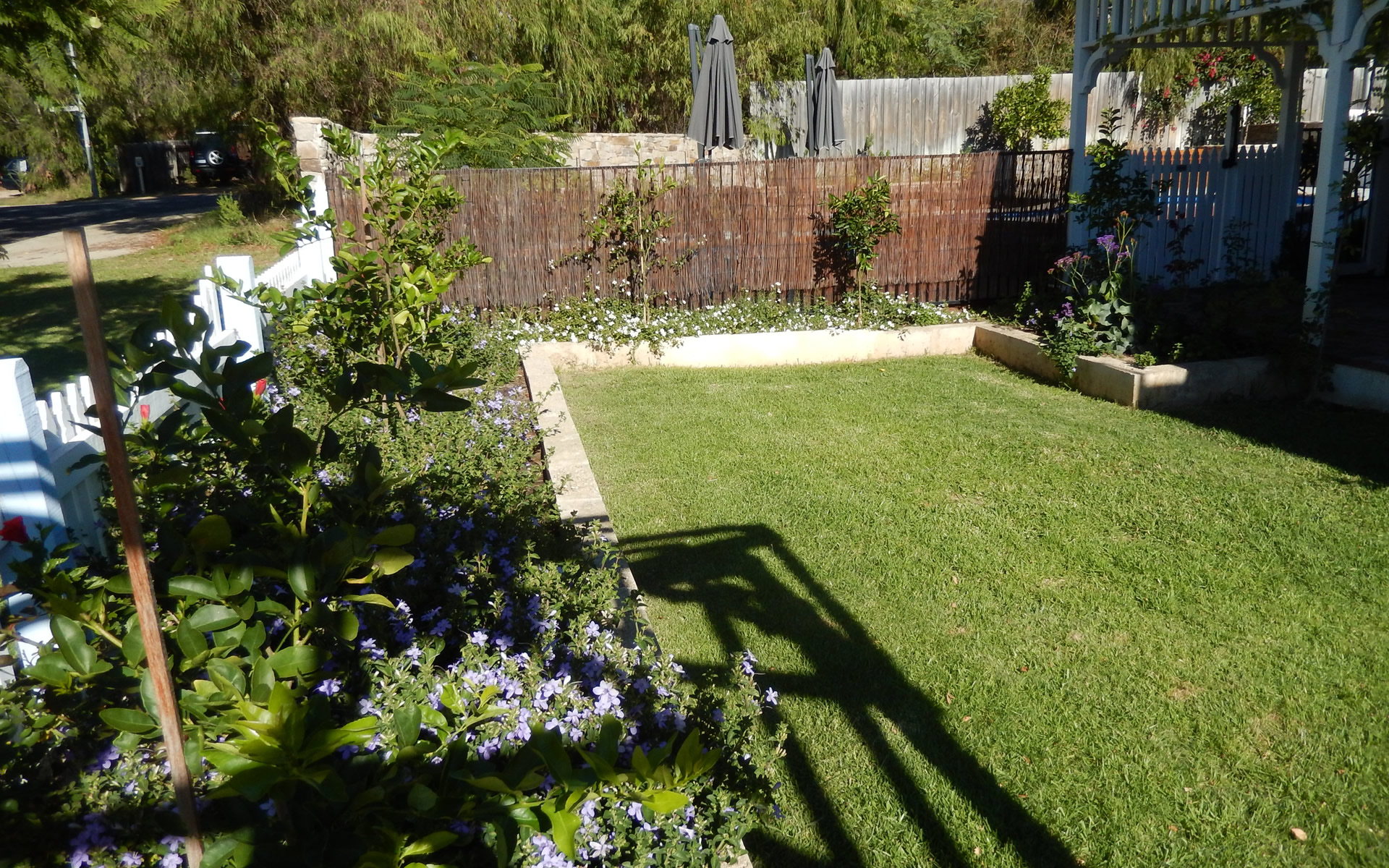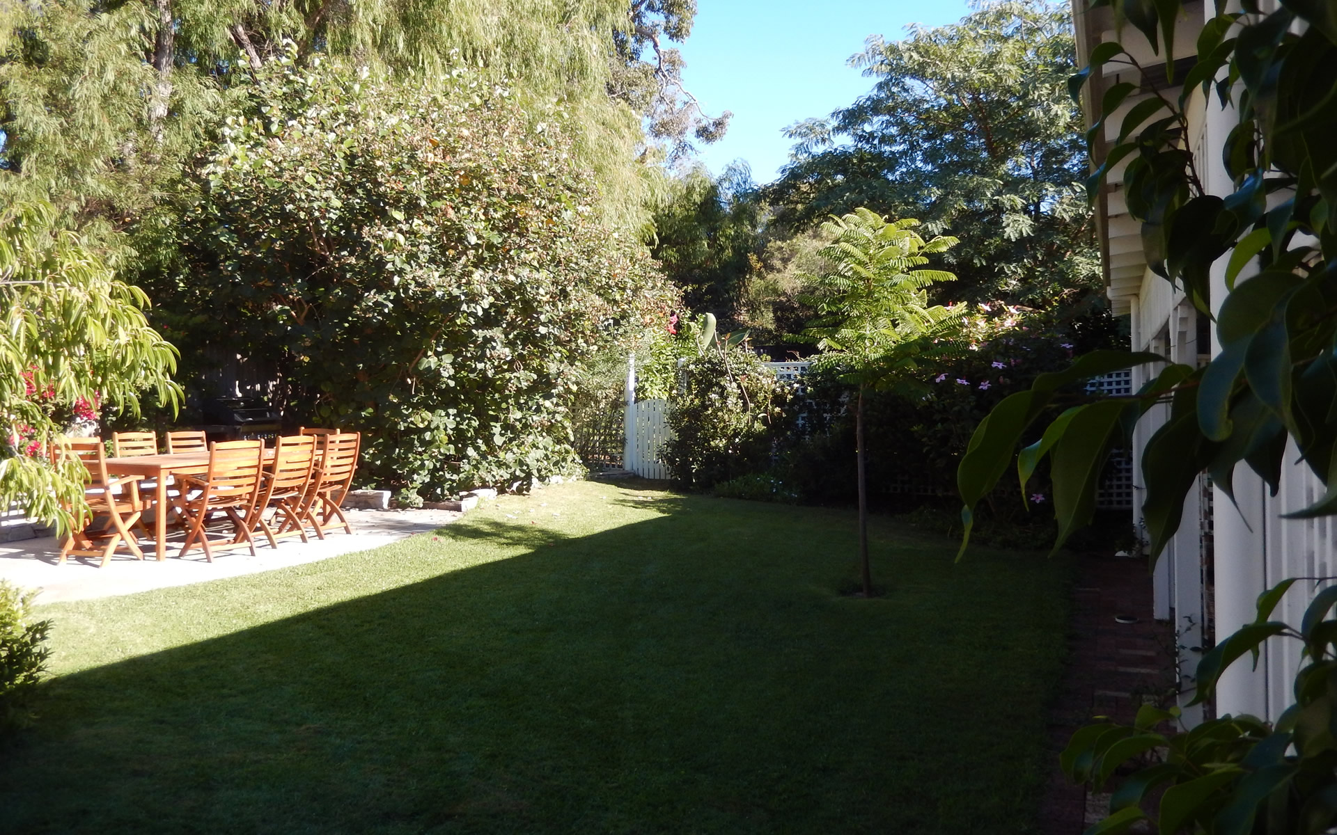 This suite features a king bed and large ensuite with bath and separate shower. The room opens via French doors to a large private patio with outdoor seating overlooking gardens at the front of the house.